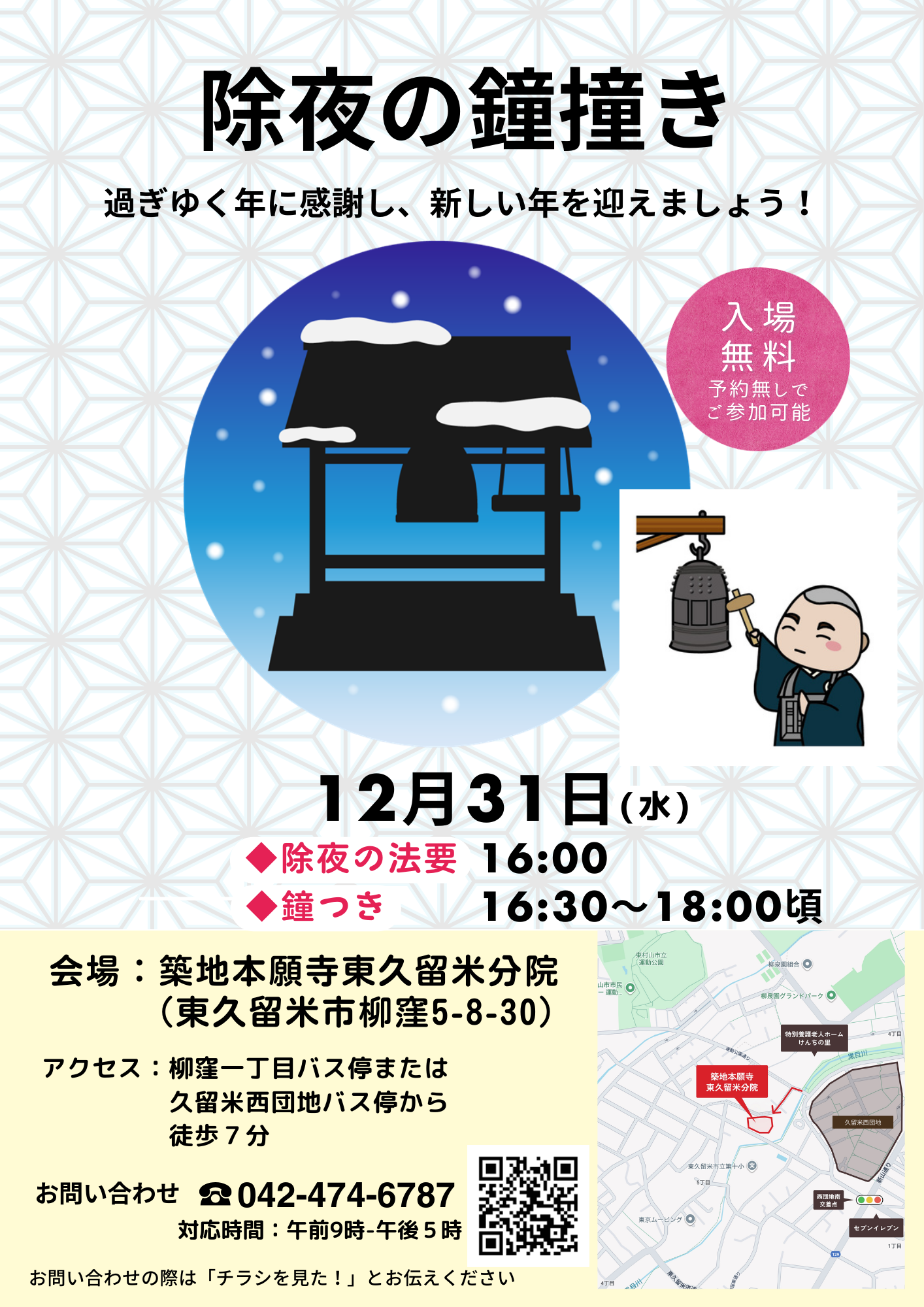 築地本願寺東久留米分院では今年も除夜の鐘つきをします。